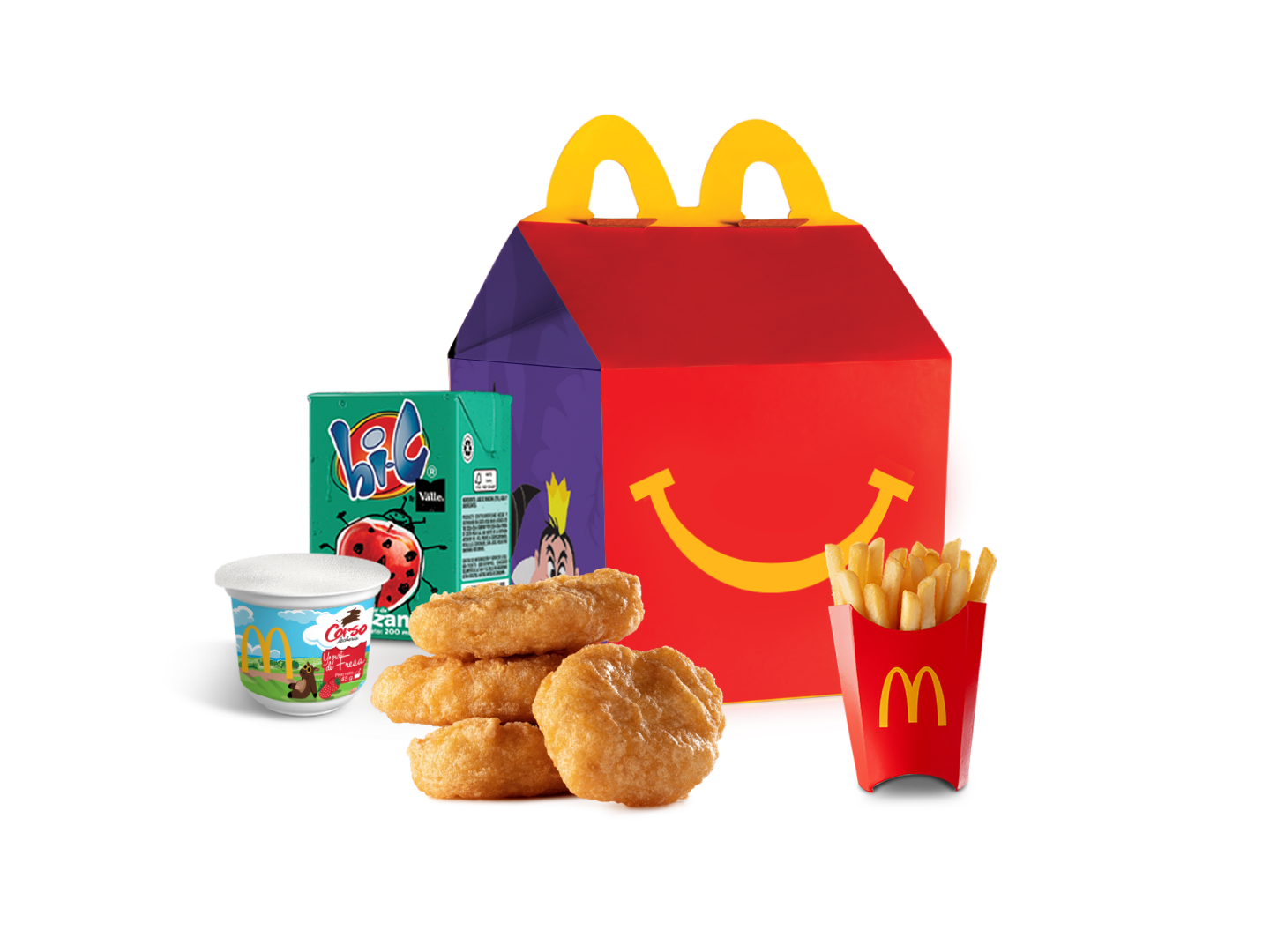 Cajita Feliz con 4 Chicken McNuggets, papas kids, yogurt de fresa y néctar de manzana.