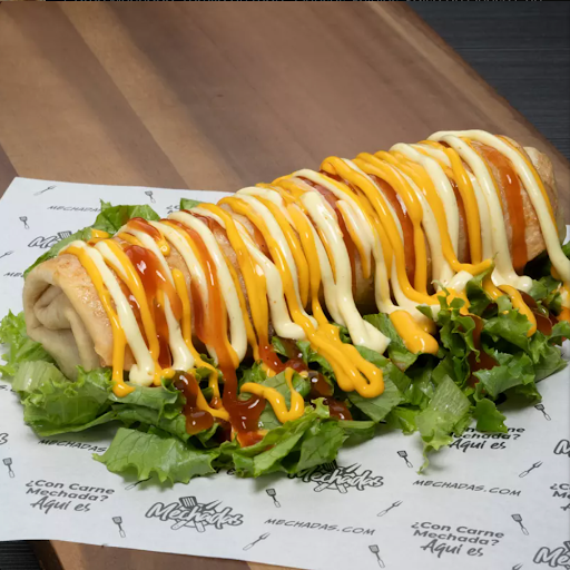 Deliciosa y jugosa carne mechada con quesos, frijoles, salsa de queso cheddar, lechuga, pico de gallo, mayonesa de la casa y kétchup, en tortilla de harina a la plancha.