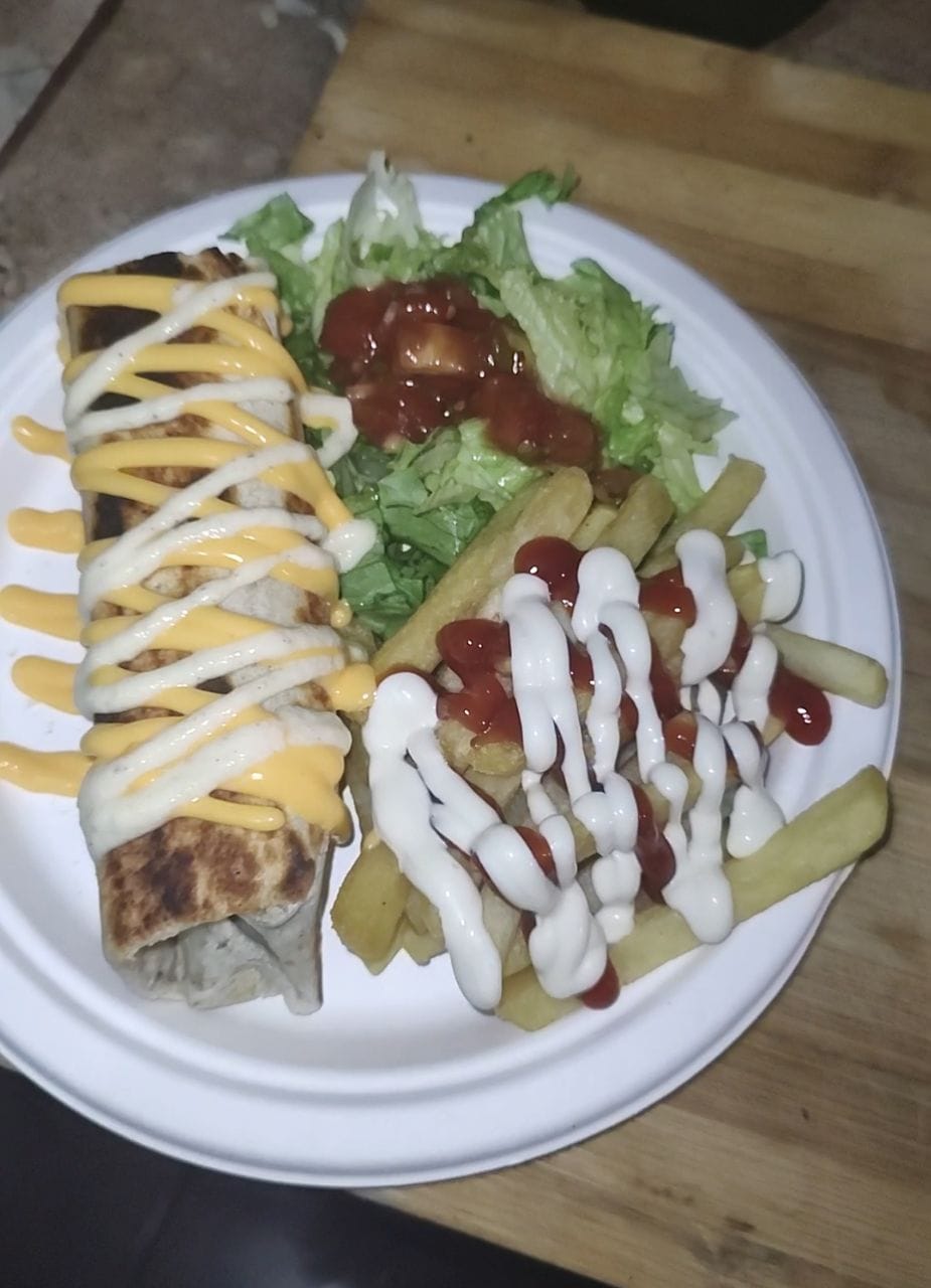 Fajitas de pollo empanizadas con papas fritas, ensalada y salsas a elegir.