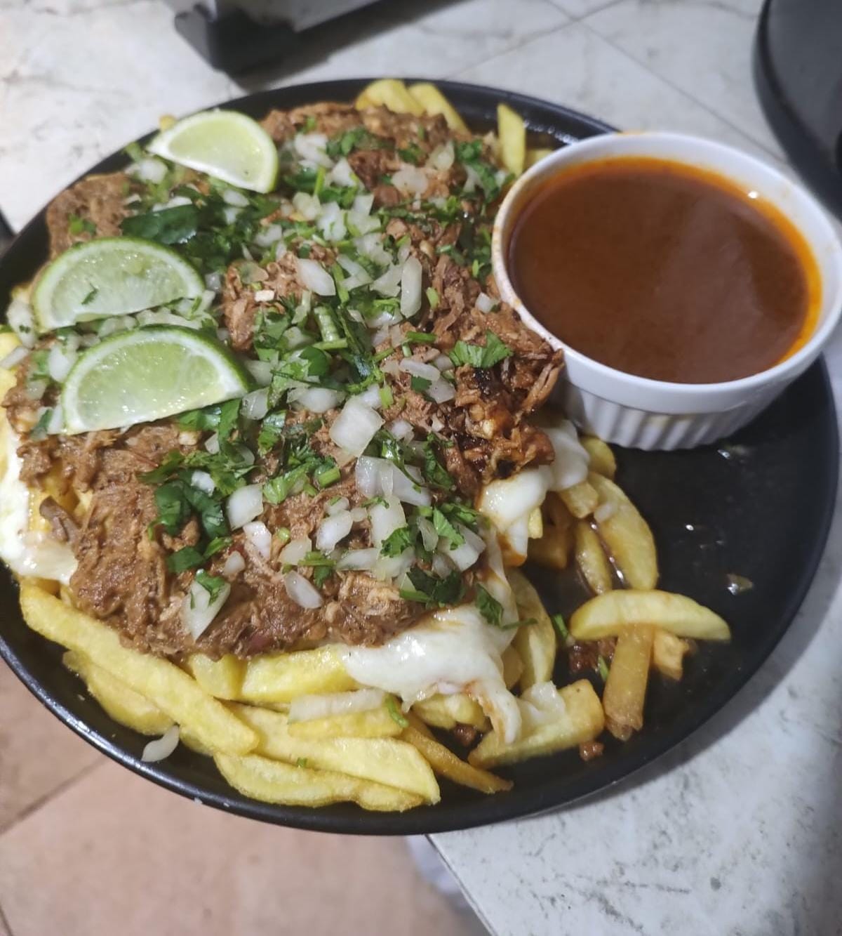 Papas birria , ( papas fritas , queso mozzarella , carne de birria , culantro y cebolla con limón ) acompañadas de consomé de birriaPapas birria , ( papas fritas , queso mozzarella , carne de birria , culantro y cebolla con limón ) acompañadas de consomé de birriaPapas birria , ( papas fritas , queso mozzarella , carne de birria , culantro y cebolla con limón ) acompañadas de consomé de birria