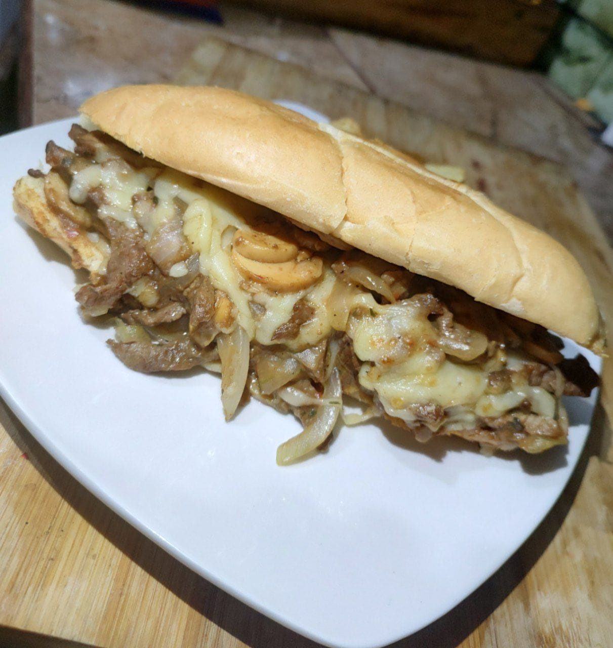 Pan baguette ,fajitas de pollo y hongos salteadas con cebolla y chile dulce , queso mozzarella fundido . acompañado de papas fritas