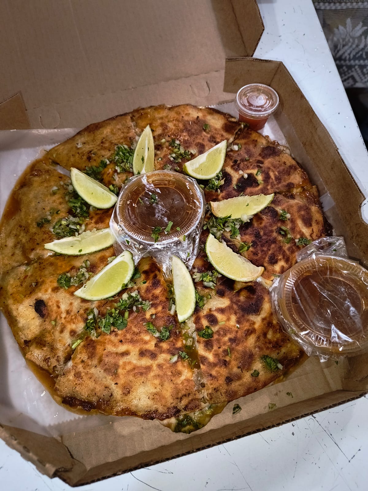 Tortillas grande de harina, rellenas de queso mozarella, carne de birria, culantro, cebolla, acompañado de caldo de birria, limón y chile.