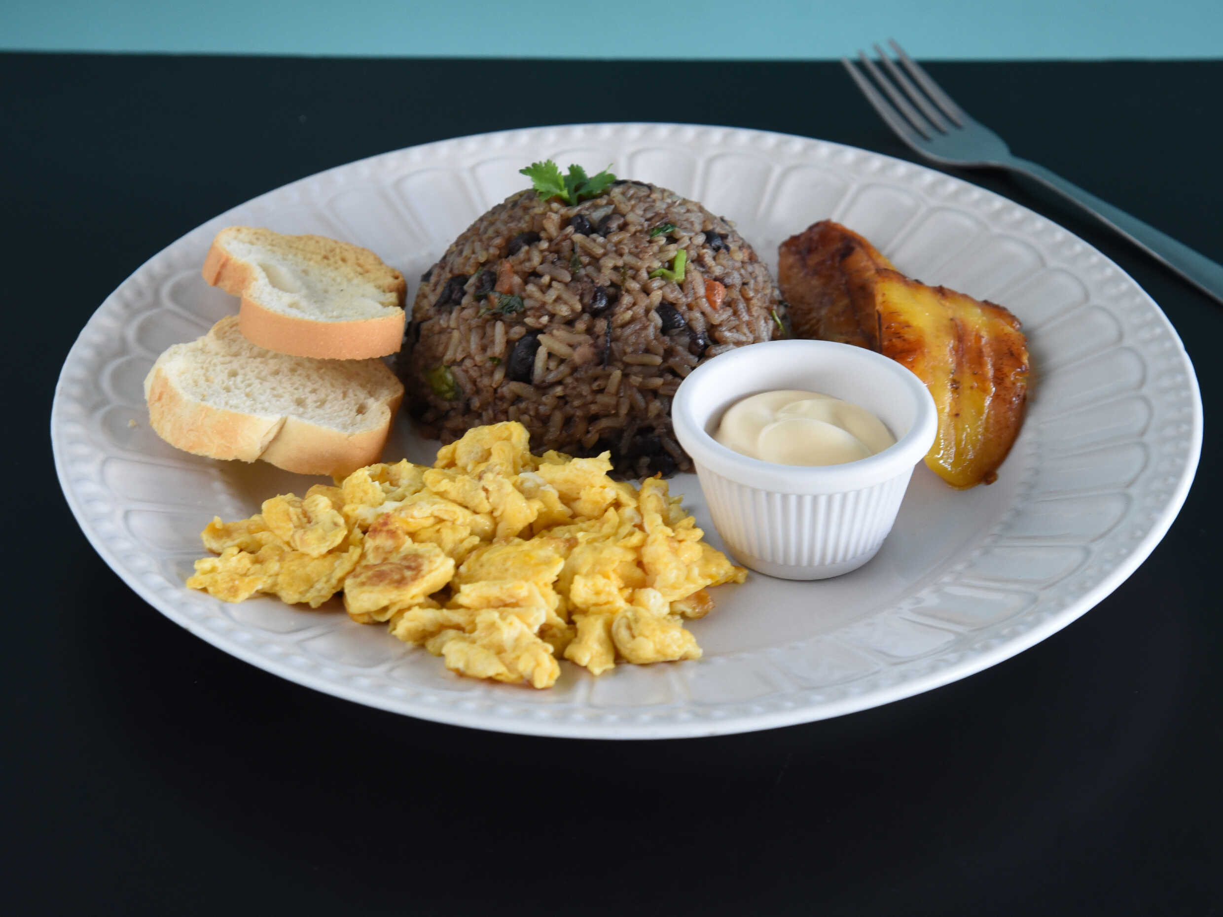 Desayuno Tipico: huevo, natilla, pinto, platano y salchicha