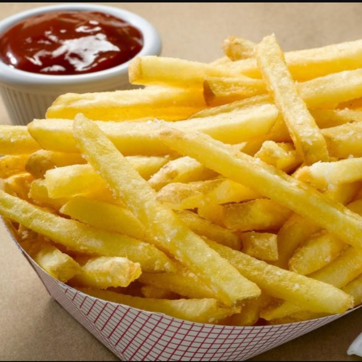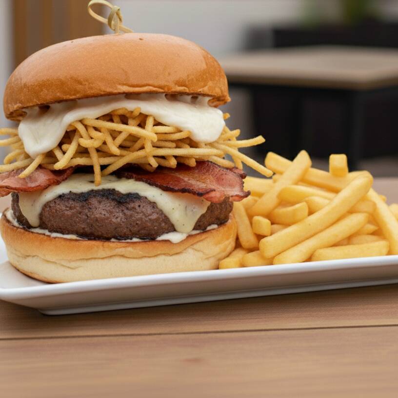 Hamburguesa grande de carne torta de res, papa ripio, tocineta, queso mozzarella y papas a la francesa.