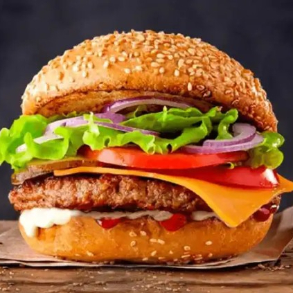 Hamburguesa grande con torta de res, papa ripio, tocineta, queso mozzarella y papas a la francesa.