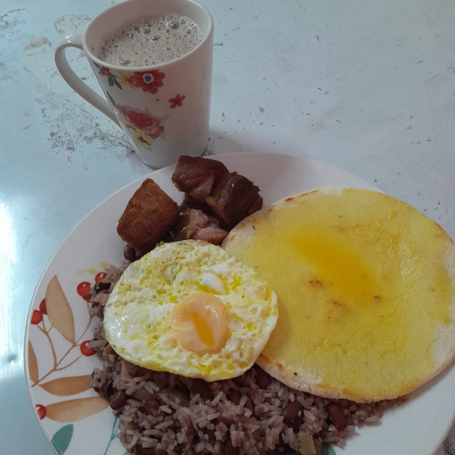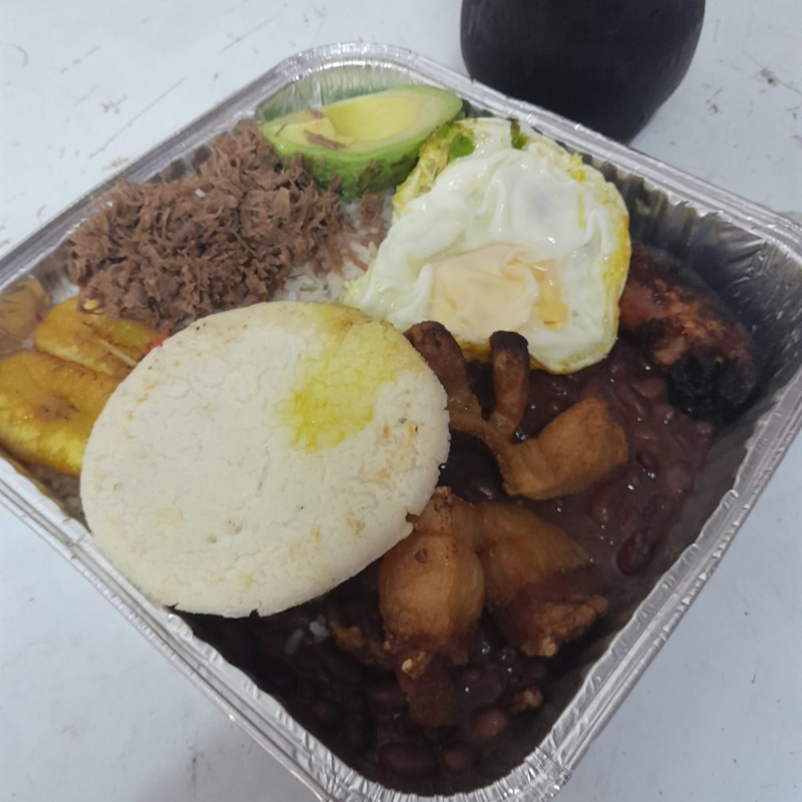 arroz,frijoles,chicharron carnudo,huevo,carne molida,arepa,aguacate,chorizo santarrosano,tajada de maduro.