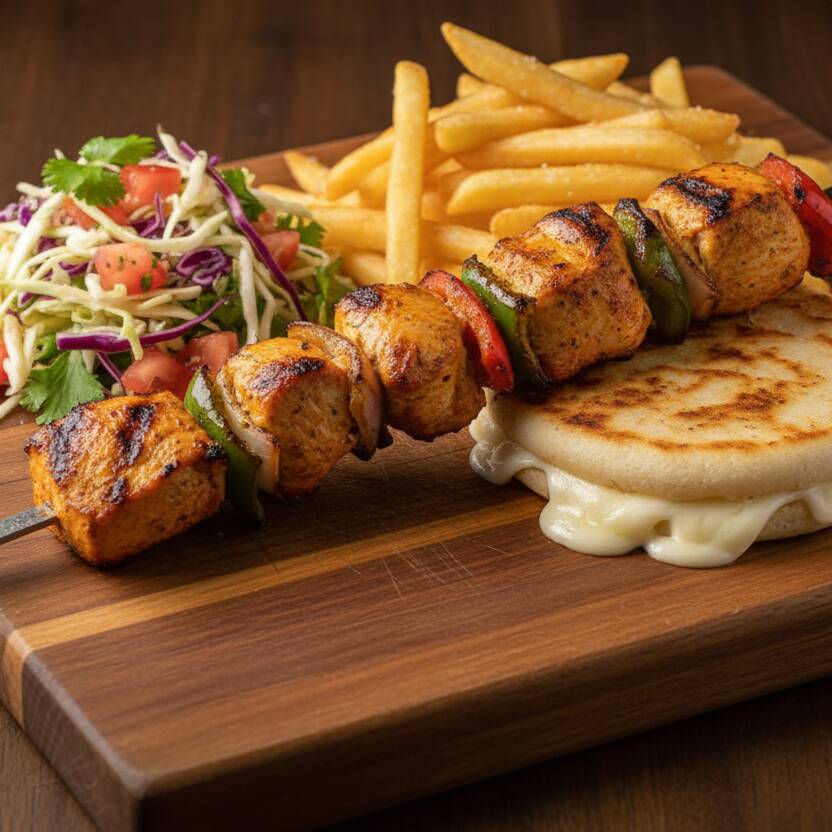 Pincho de pollo o cerdo con ensalada de repollo y tomate, papas a la francesa y arepa con queso.