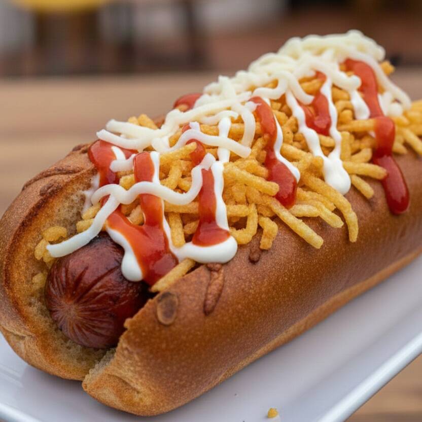 Perro caliente con salchicha ranchera, papa ripio, salsa de tomate, mayonesa y queso mozzarella.