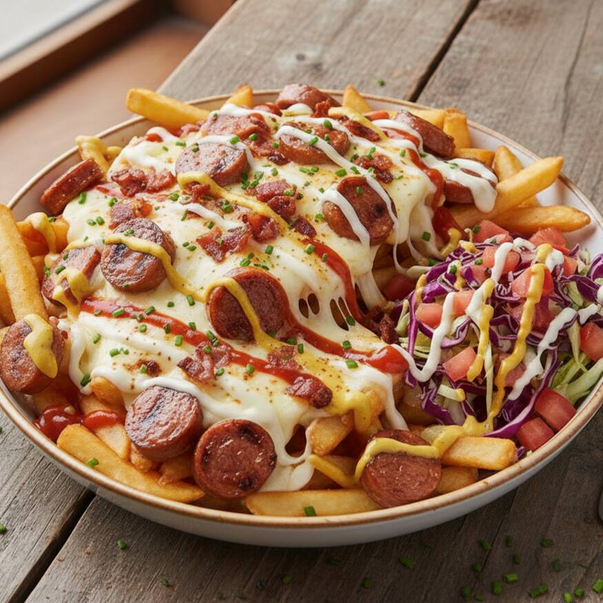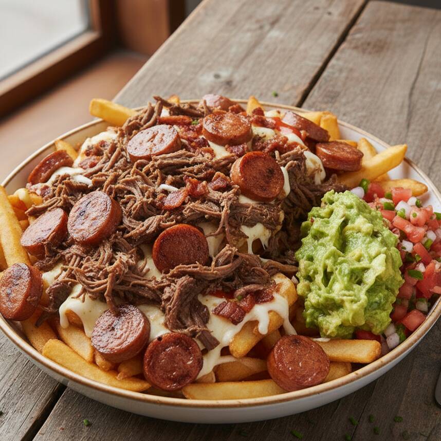 Papas grandes con salchicha, tocineta, queso mozzarella, pollo crispy, carne desmechada de res, guacamole y pico de gallo.