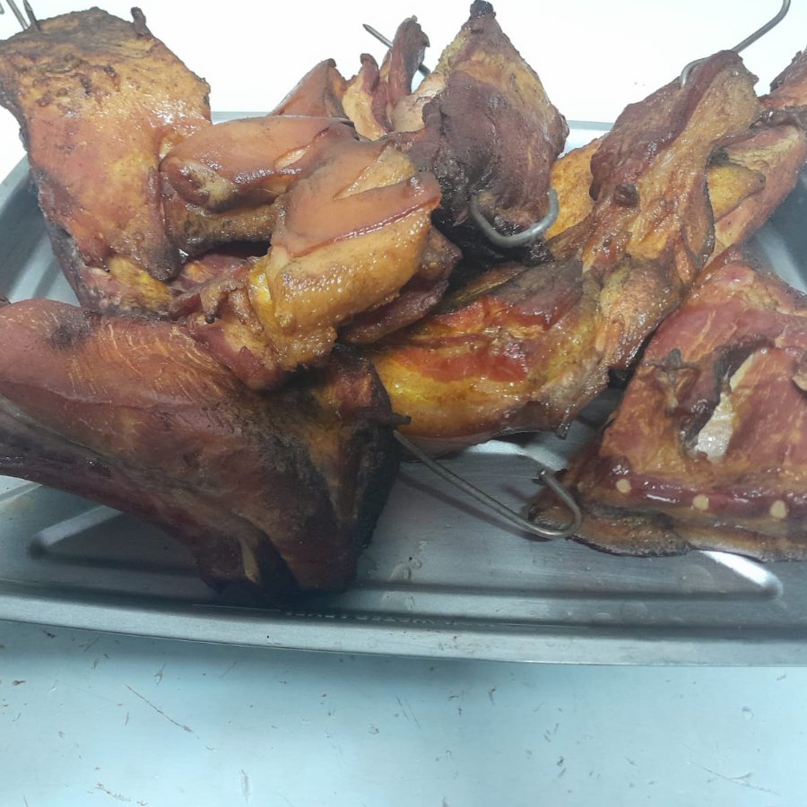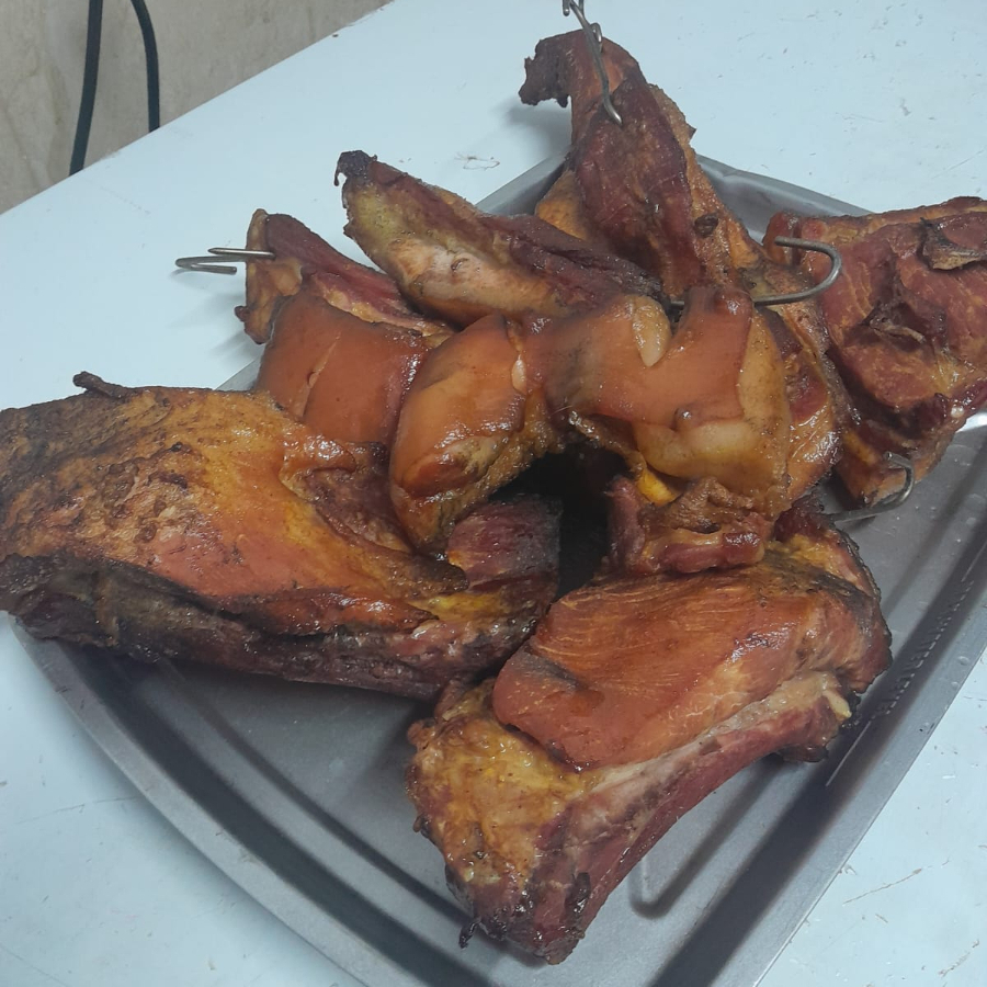 500 g De chicharrón, papas a la francesa, arepa con queso y ensalada de repollo y tomate.