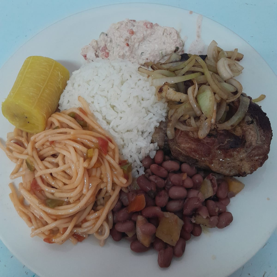 Costilla de cerdo (500 g), papas a la francesa, arepa con queso y ensalada de repollo y tomate.