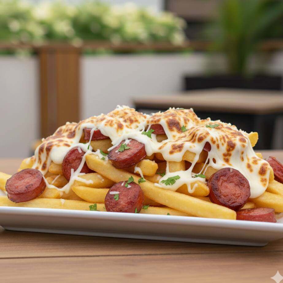 Papas pequeñas con salchicha en trozos y queso mozzarella.