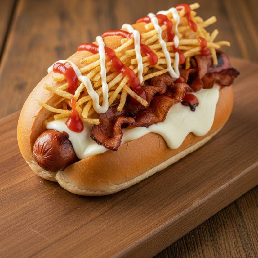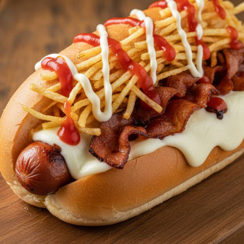 Perro con doble tocineta, papa ripio, salsa de tomate, mayonesa y queso mozzarella.