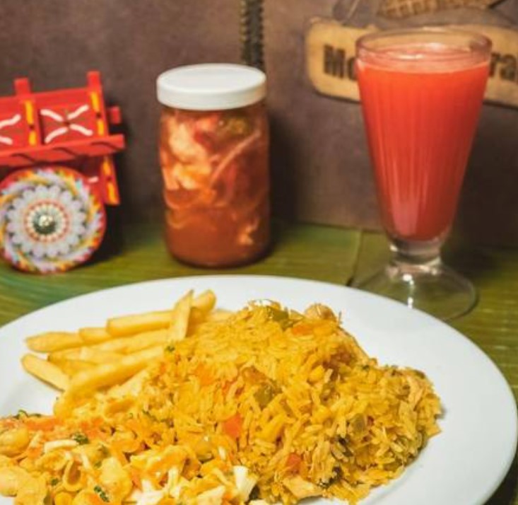 Delicioso arroz con Pollo 100% Criollo. Acompañado de Ensalada y Papas Fritas.