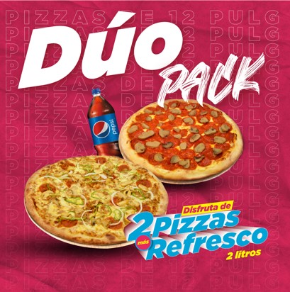 2 Pizzas de 12 pulgadas y refresco de 2 L.