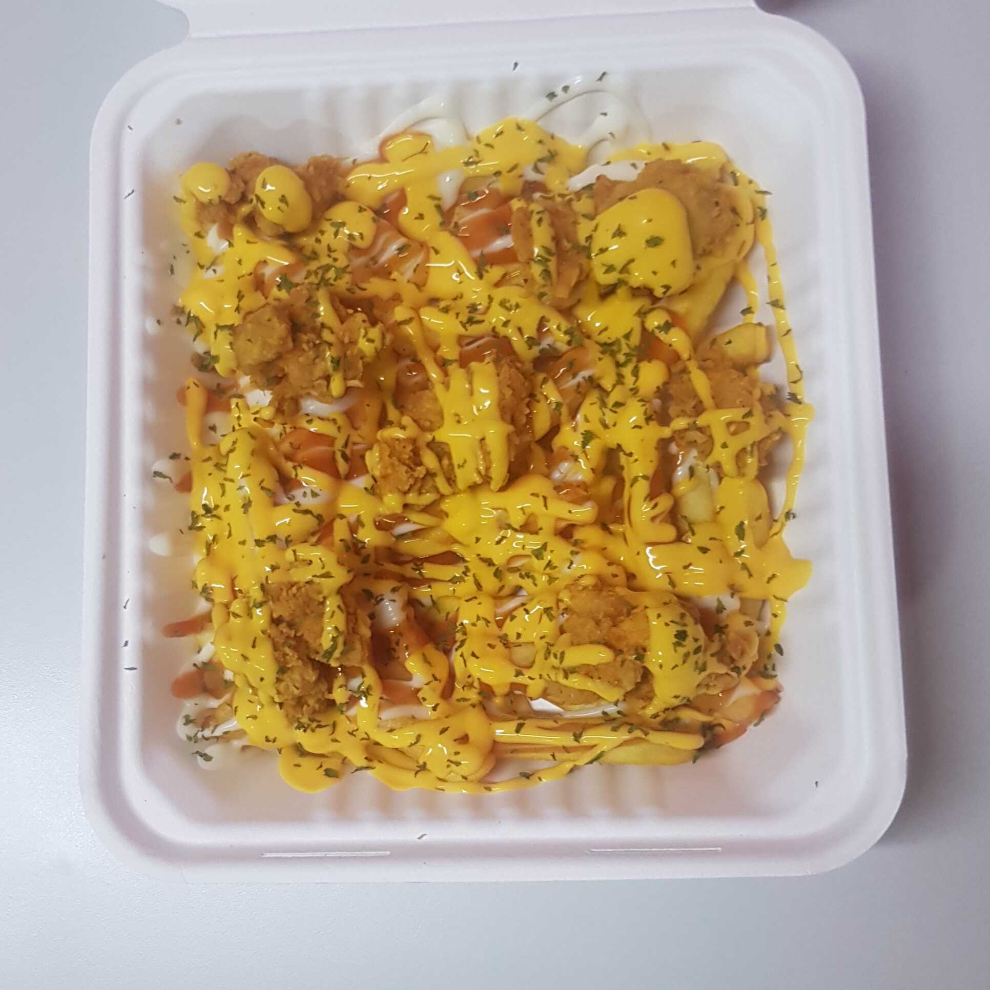 Pan de hamburguesa, mantequilla, filet de pollo crispy, salsa bbq,queso amarillo, lechuga, tomate, cebolla morada, mayoneza especial, papas fritas, te frio