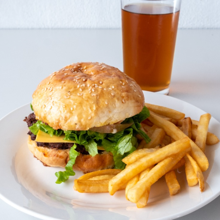 pan de hamburguesa, mantequilla , torta de carne de res, queso amarillo, salsa tomate, mayoneza, mostaza, pepenillos
