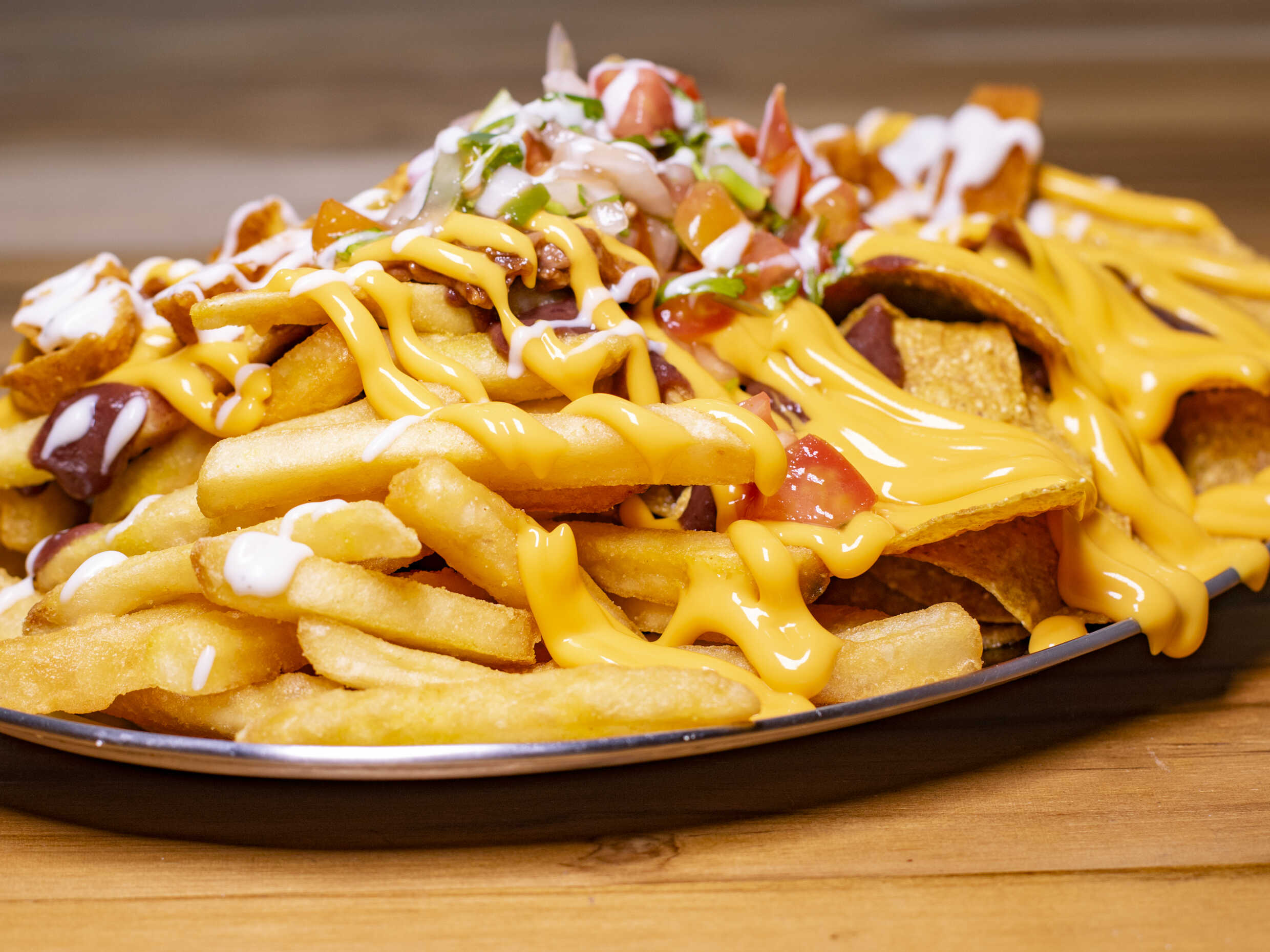 Papas fritas con frijoles molidos, pico de gallo, salsa de queso y su carne a elegir