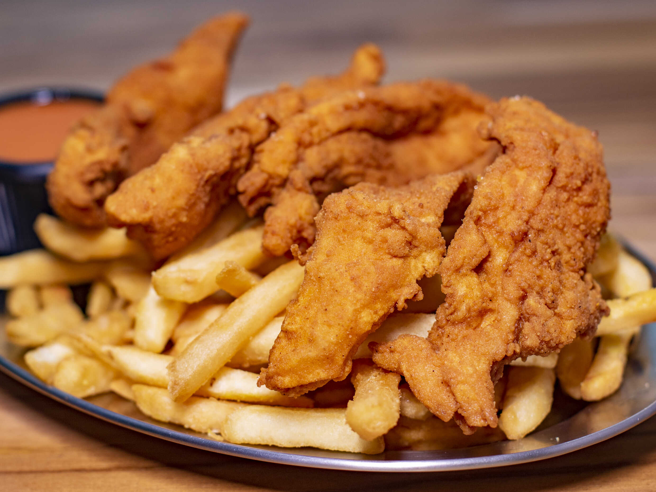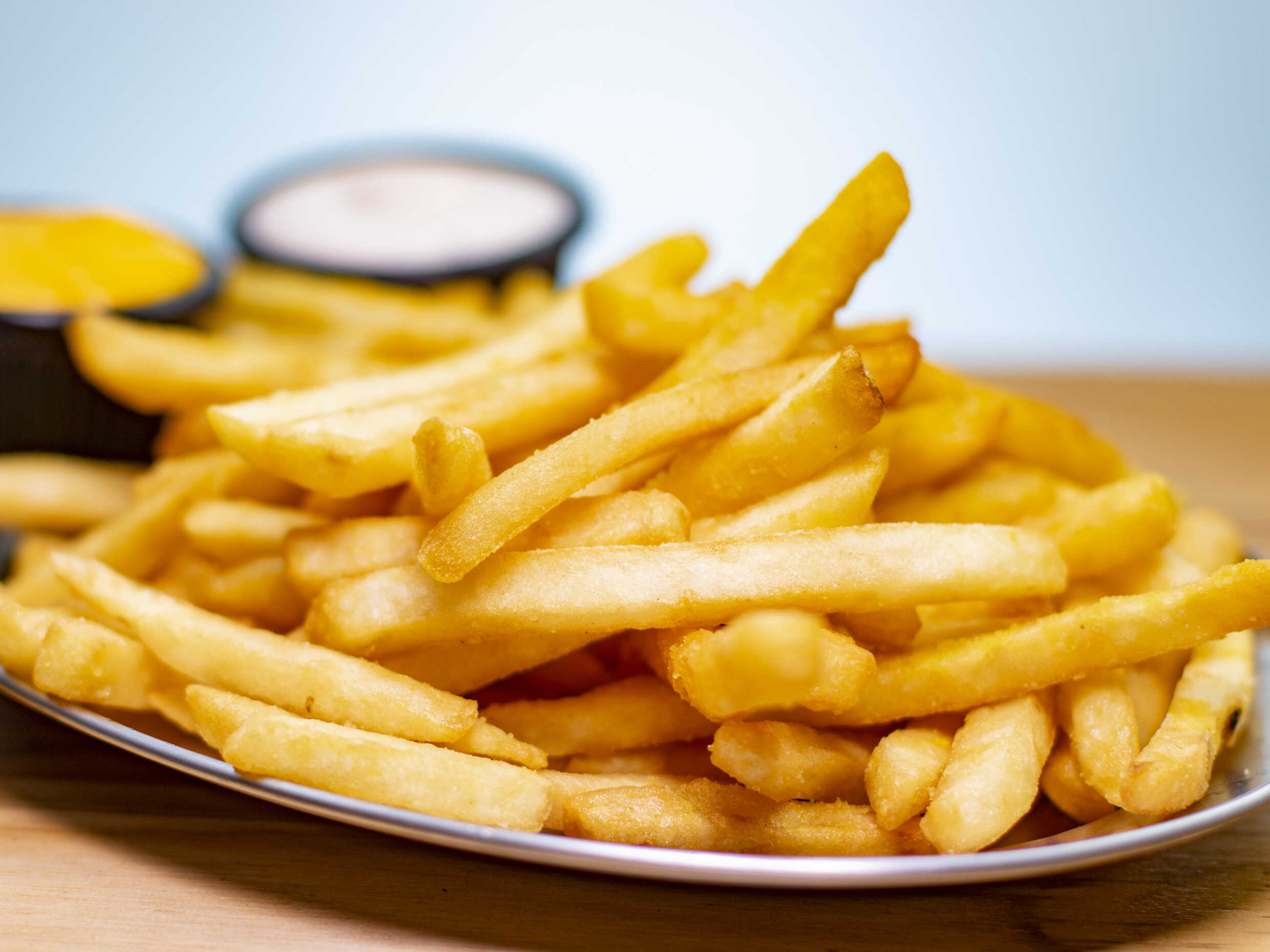 Acompañado de papas fritas y salsa de queso