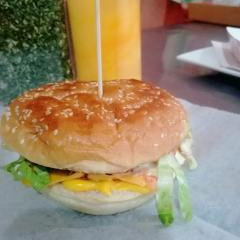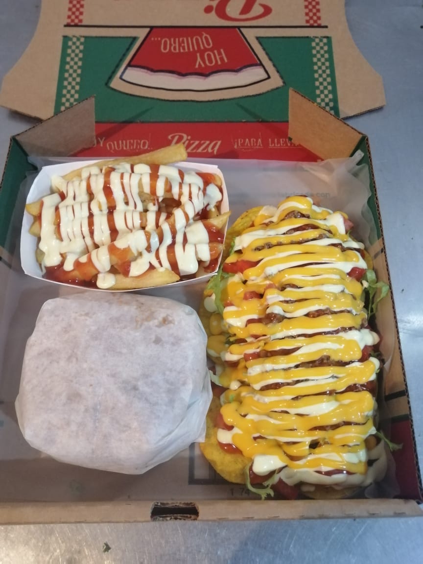 Hamburguesa especial con 3 minitacos adentro acompañada de papas fritas. Hamburguesa especial pan tomate lechuga queso amarillo torta salsas (mayonesa y tomate