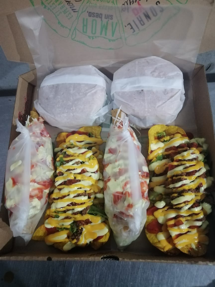 Dos hamburguesas, dos nachos, dos super tacos.