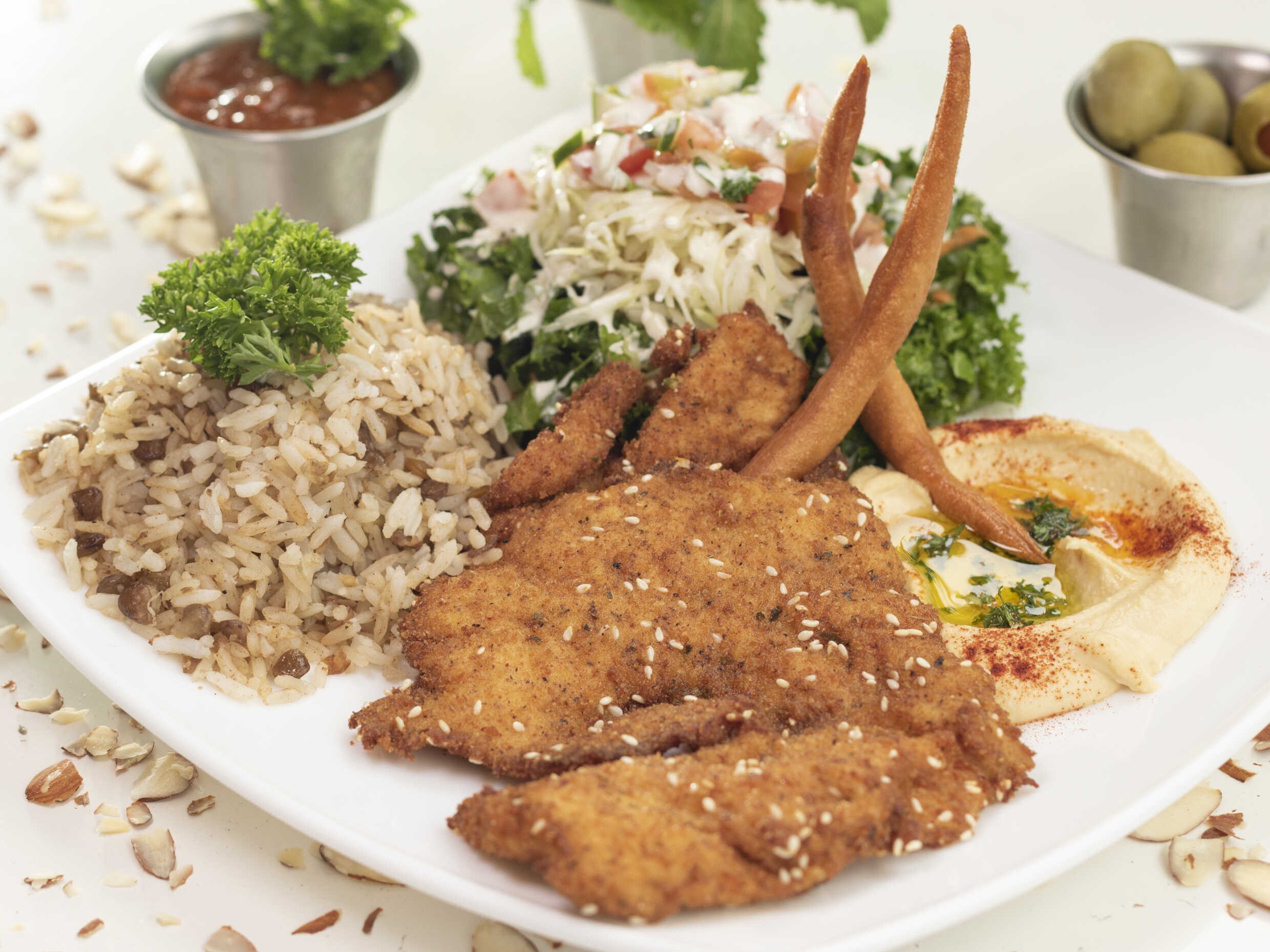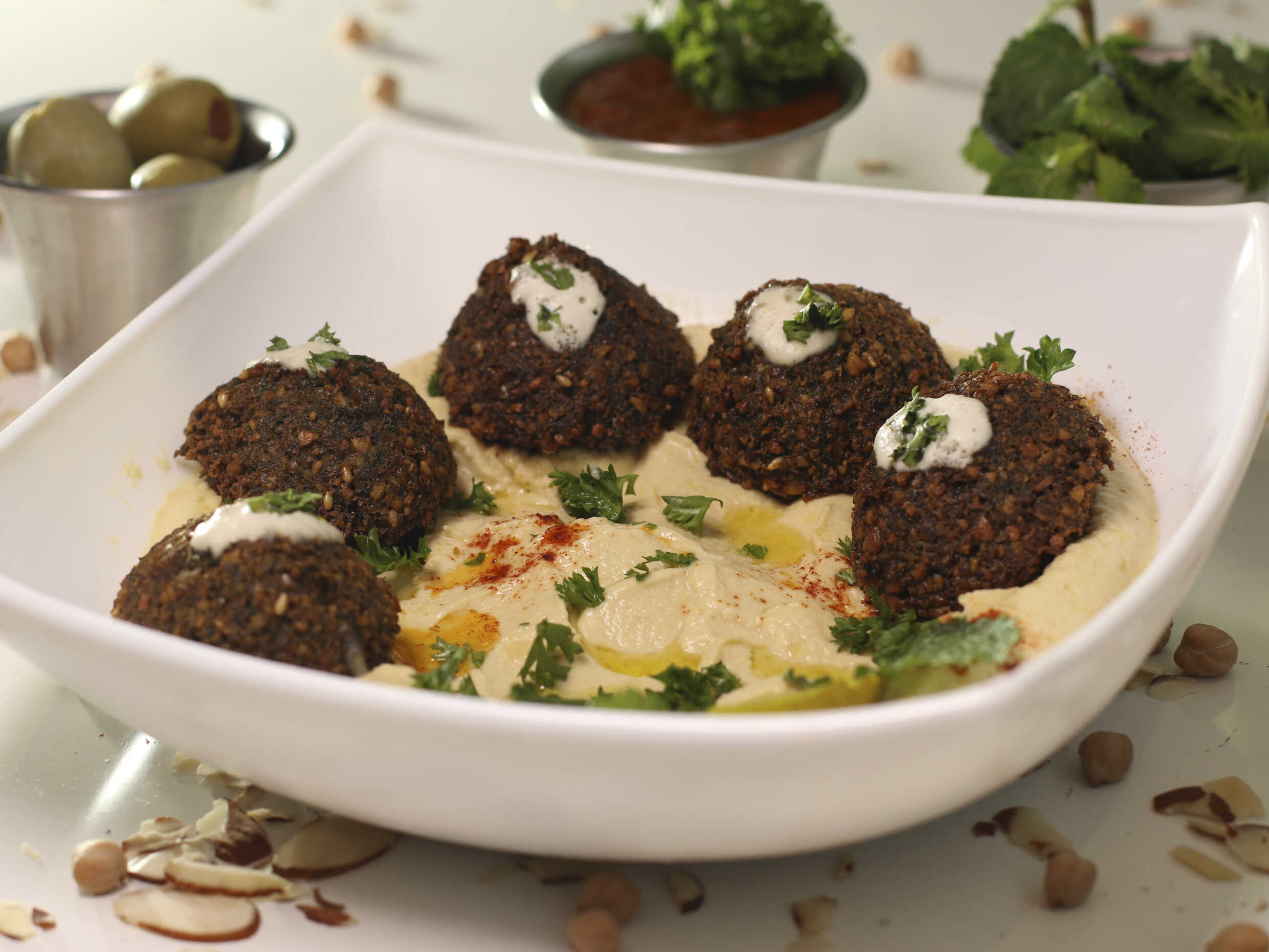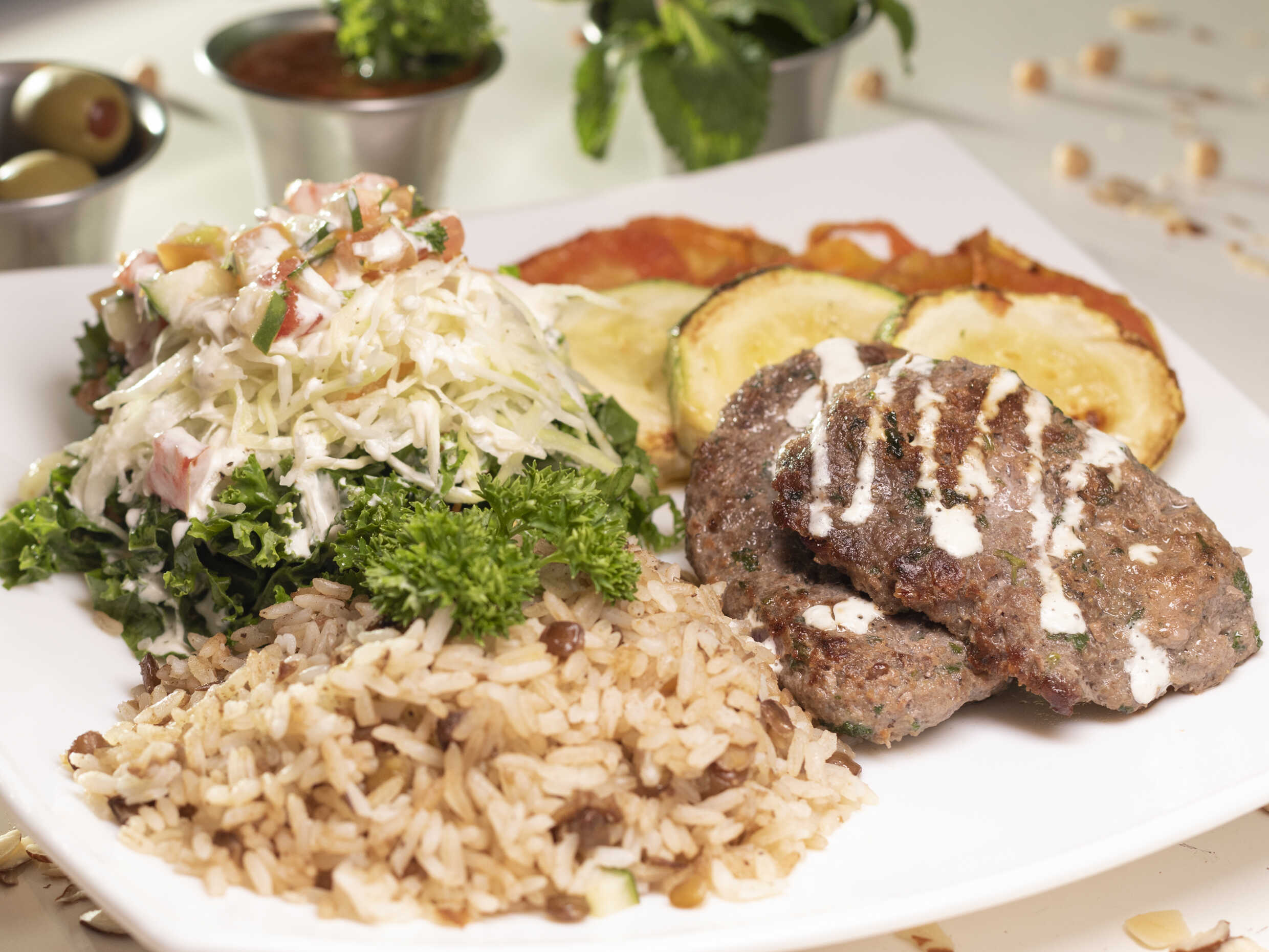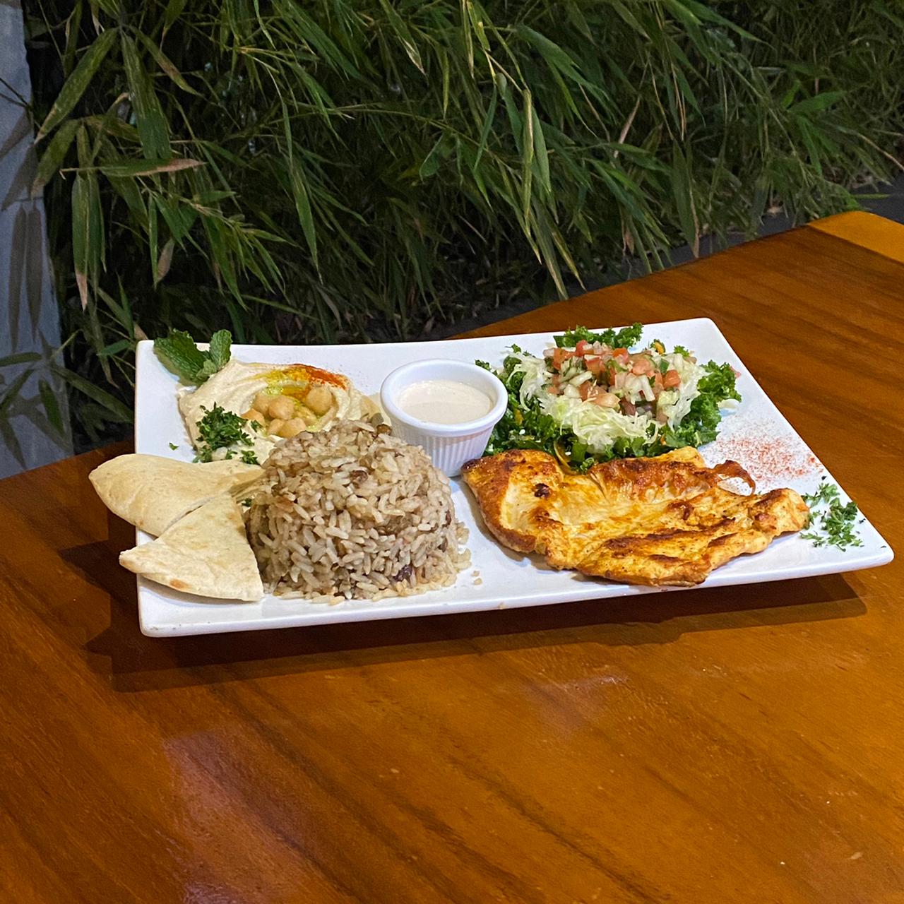 Zuchini, berenjena, papas, aceitunas, 2 falafel, hummus, salsa madbuja, tahini.