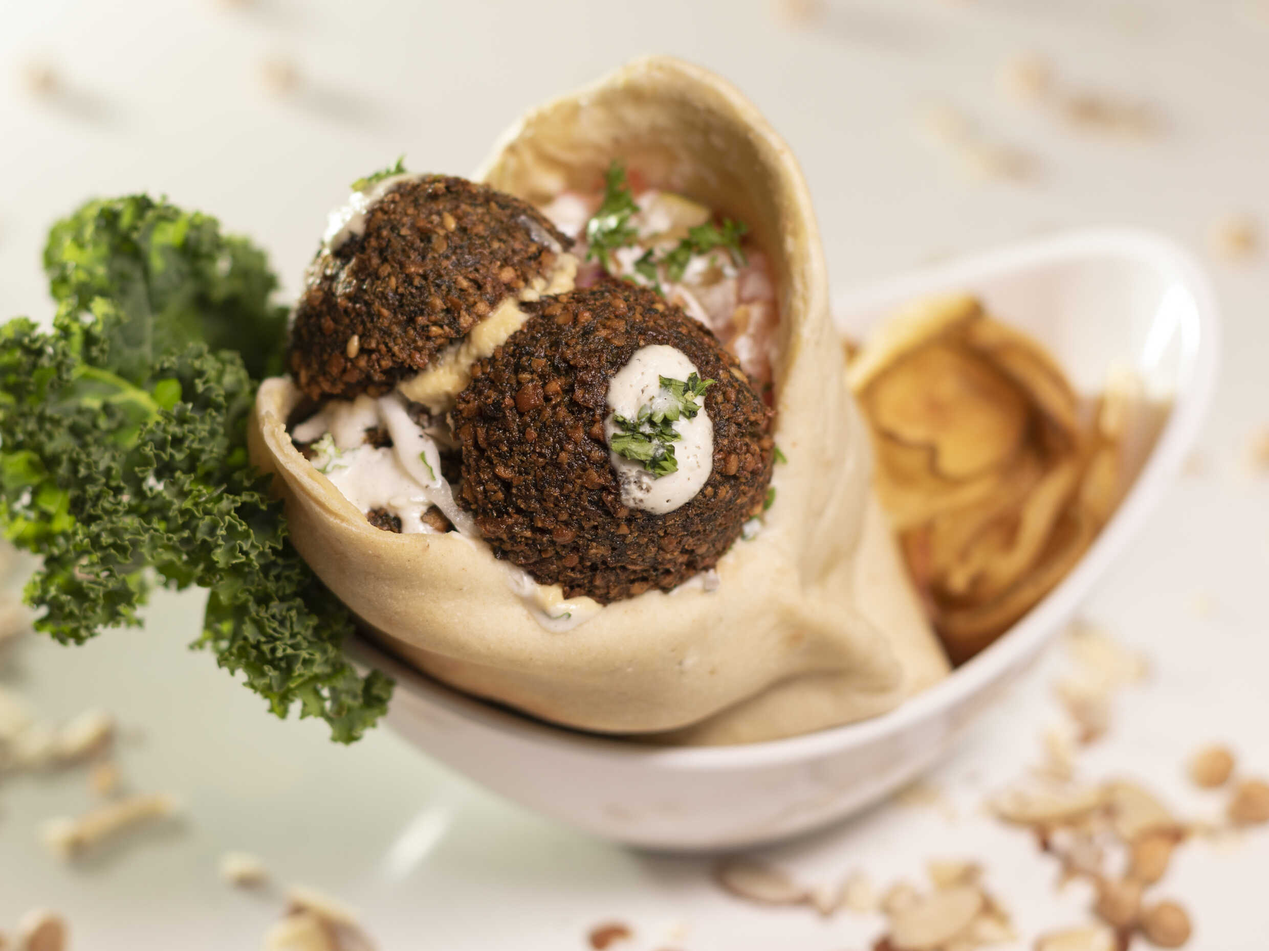 Pan Pita relleno de hummus, repollo, ensalada israelí y aderezo tahini.