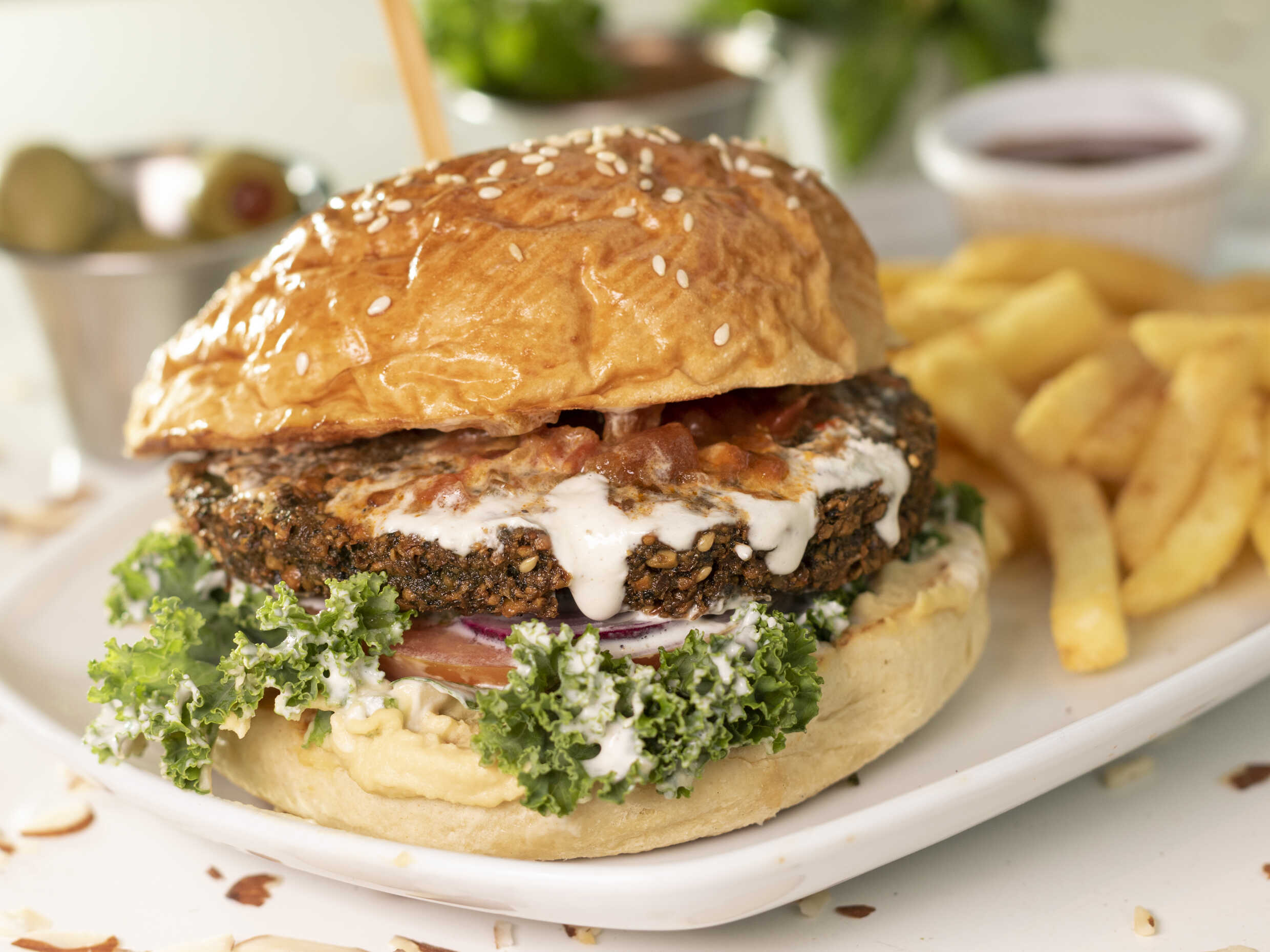 Pan artesanal con deliciosa torta de garbanzo, cebolla asada, tomate asado, repollo, hummus y aderezo tahini. Acompañado de papas fritas y aderezo toum.