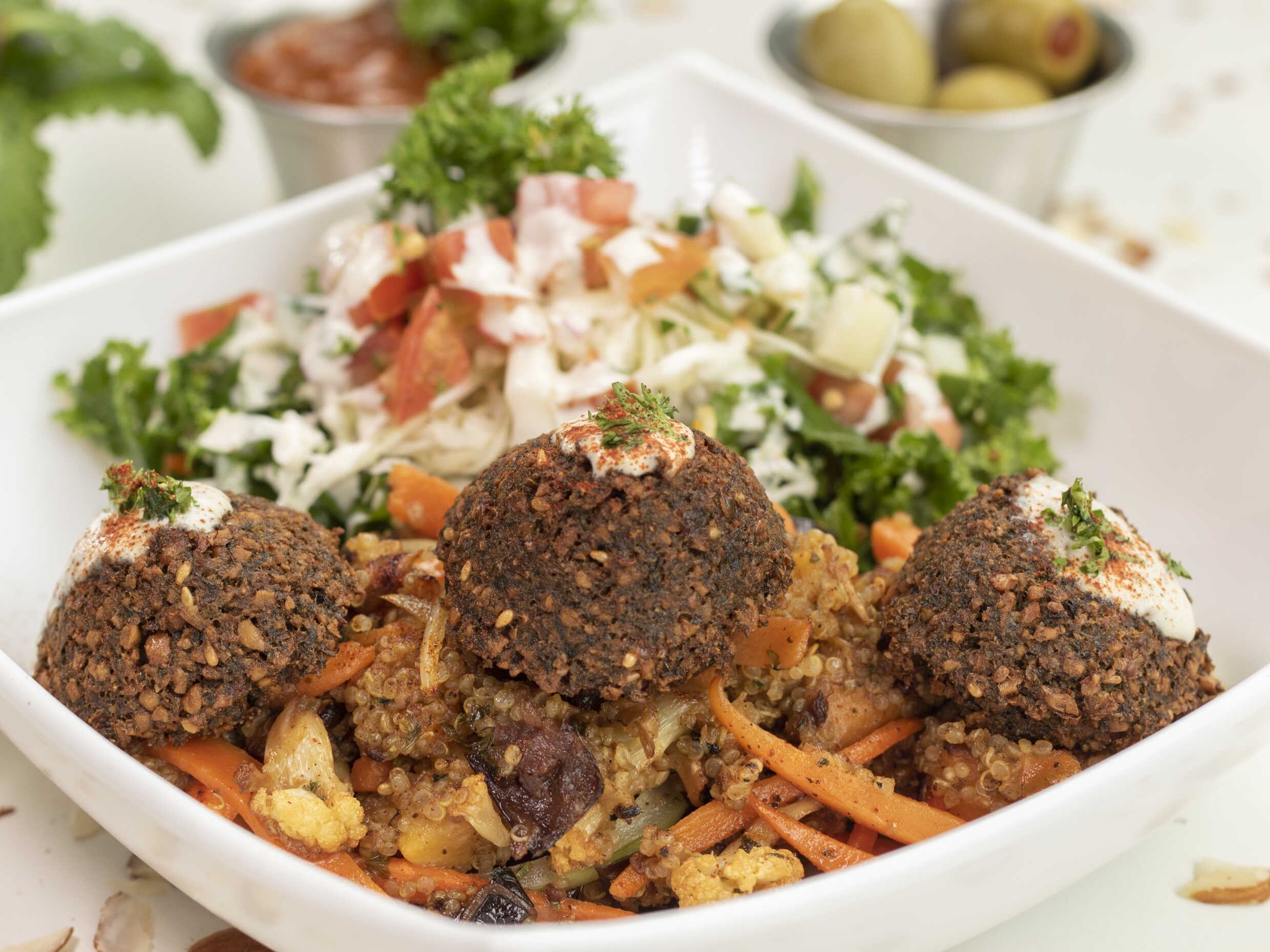 Croquetas de garbanzo acompañado de berenjena, zanahoria, camote, salteado con cebolla, jengibre, aceite de coco y ensalada israelí.