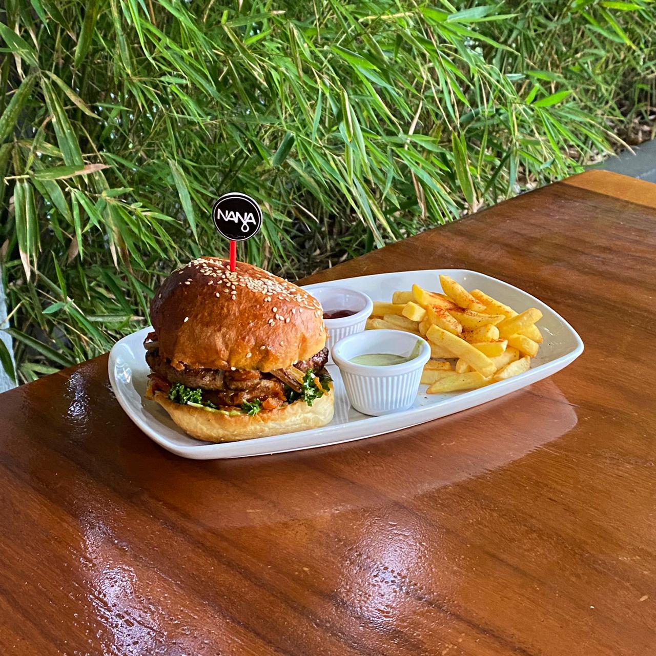 Pan artesanal con jugosa torta de cordero, hummus, tomate, cebolla a la parrilla y BBQ de frutas. Acompañado de papas fritas y aderezo toum.
