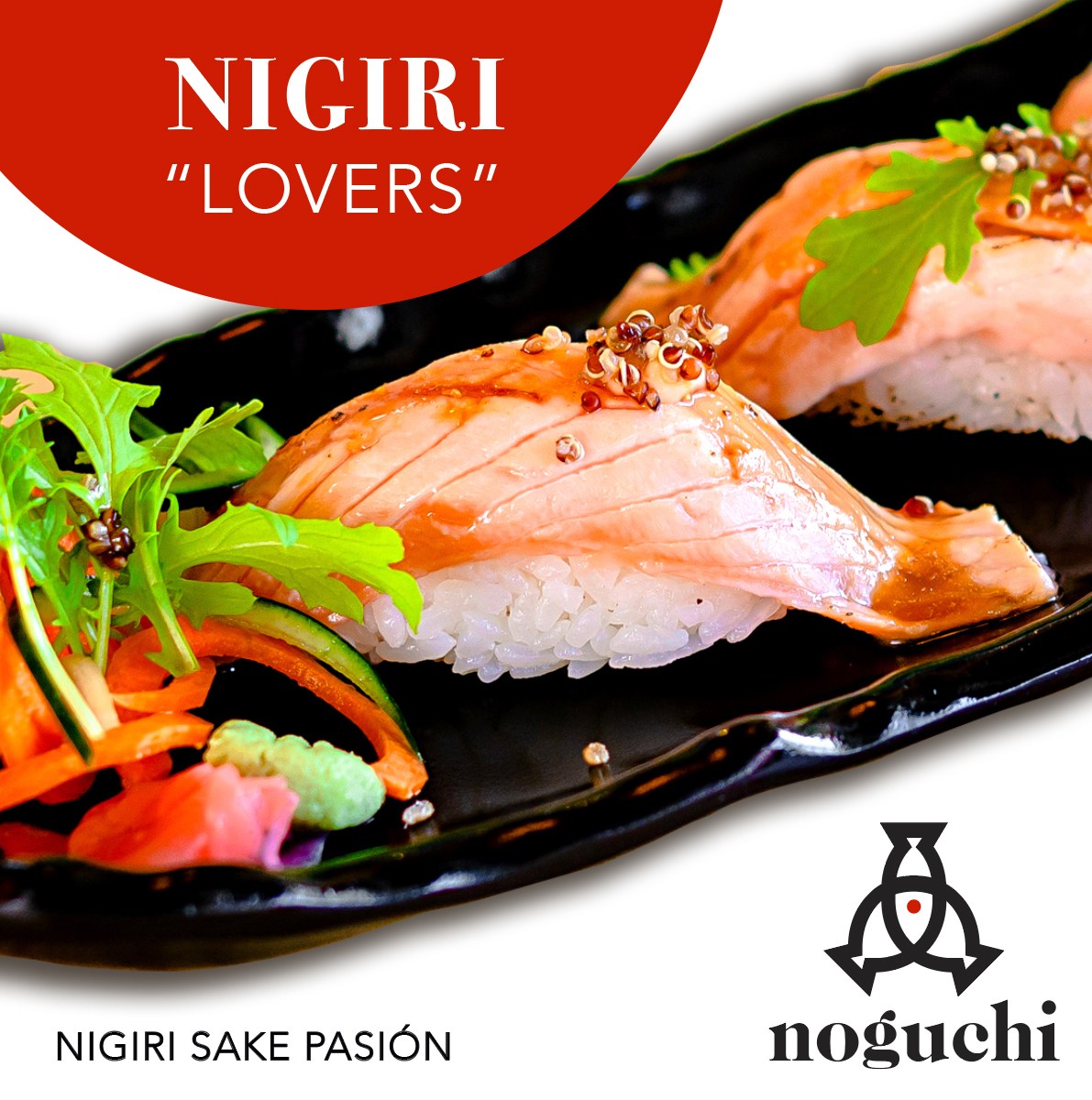 Nigiris de salmón, flambeados con salsa de maracuyá y ají.