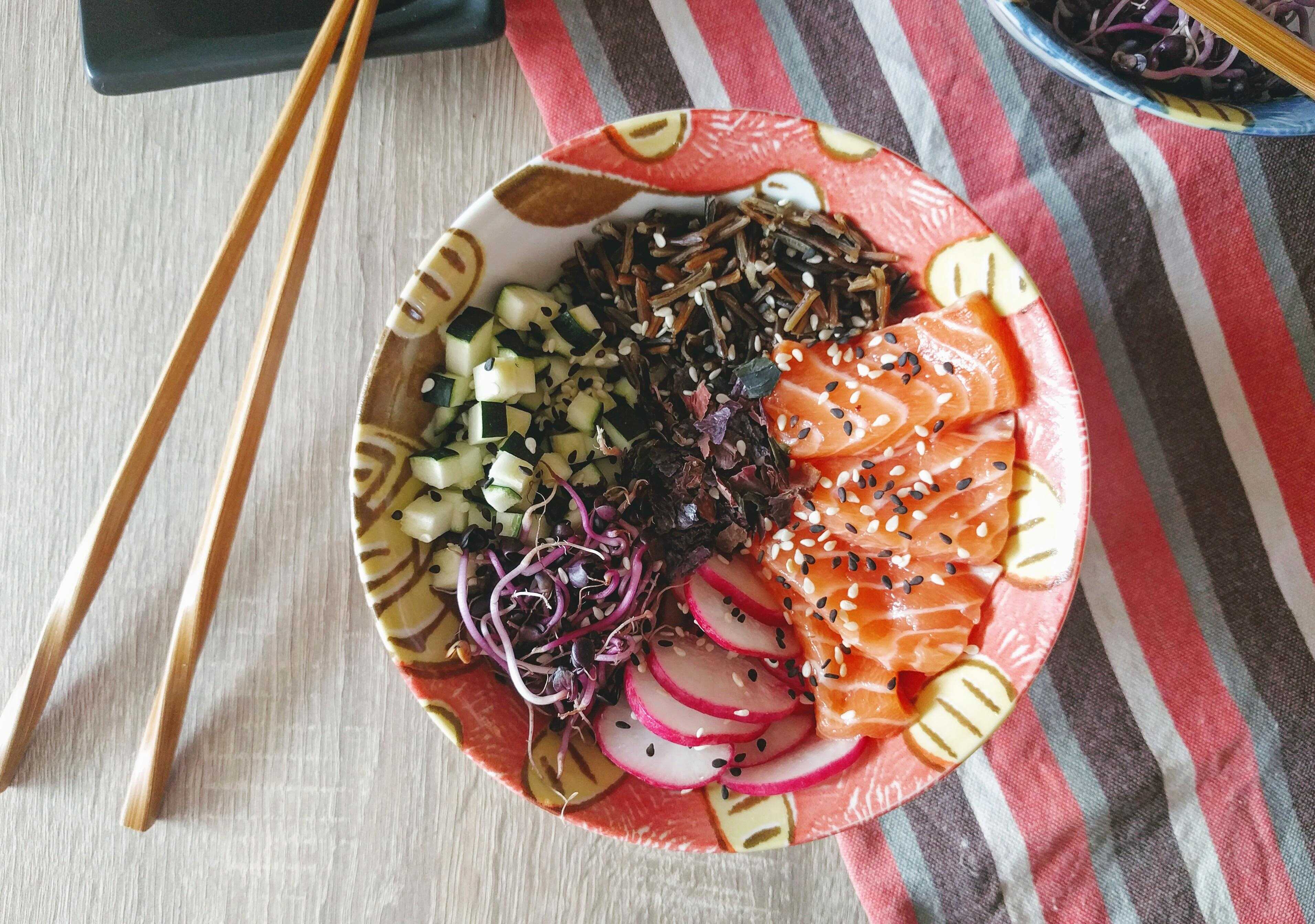 Bowl de salmón fresco, sobre una base de arroz, junto a ingredientes frescos como manzana, aguacate, cebollino, kizami nori, gary (encurtido de jengibre) y salsa de maracuyá con ají.