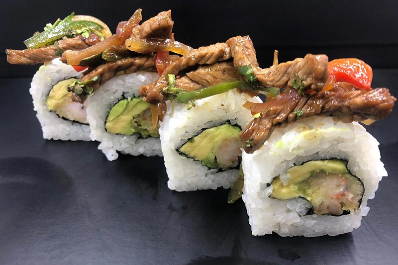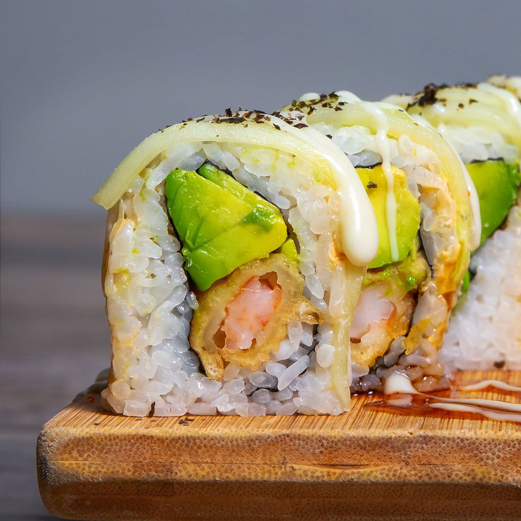 Aguacate, queso crema, camarón panko con cobertura de mango y salsa maracuyá y sésamo.