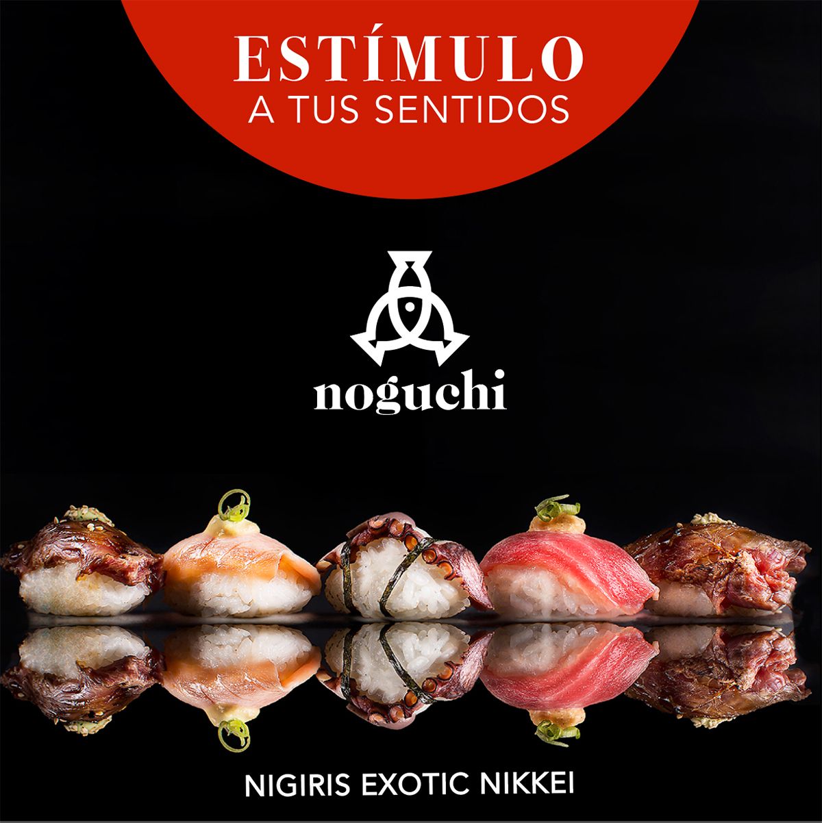 Nigiris de salmón, flambeados con salsa de maracuya y ají.