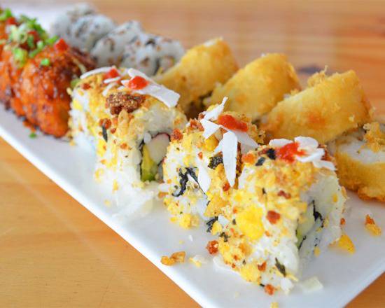 Relleno de camarón empanizado, queso crema, atún, cobertura de salmón, aguacate y Tampico de surimi.