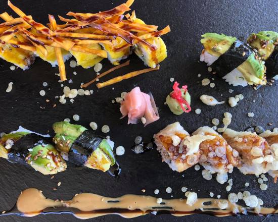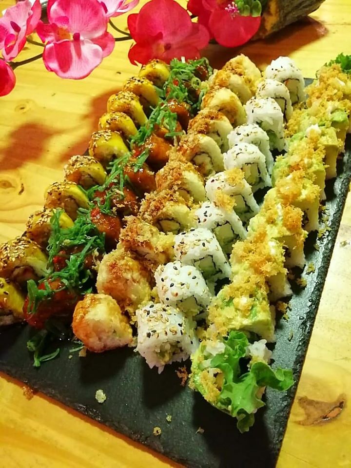 Vietnamita roll de surimi, Tico Roll, Dragón Mirón, California Roll, Tempura Roll, (40 piezas). Adicionales: gari pink, salsa miel de soya, salsa soya, wasabi, 4 sobre de palillos ¡Ajústate una combinación exquisita a tu medida!