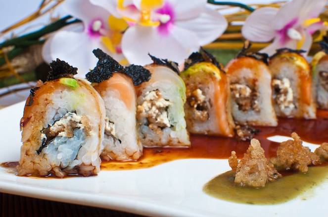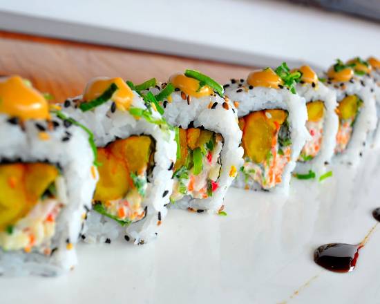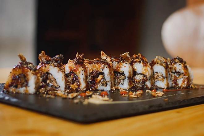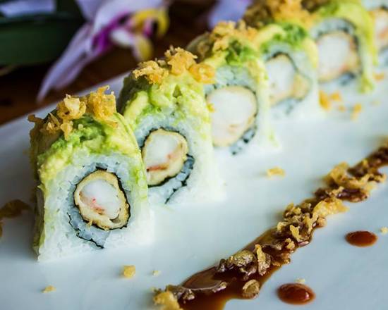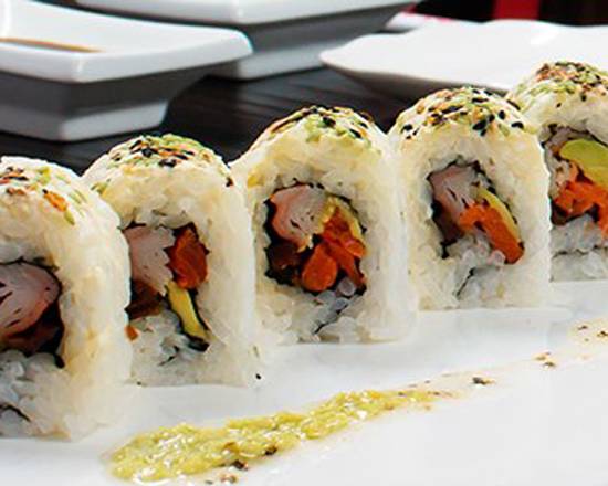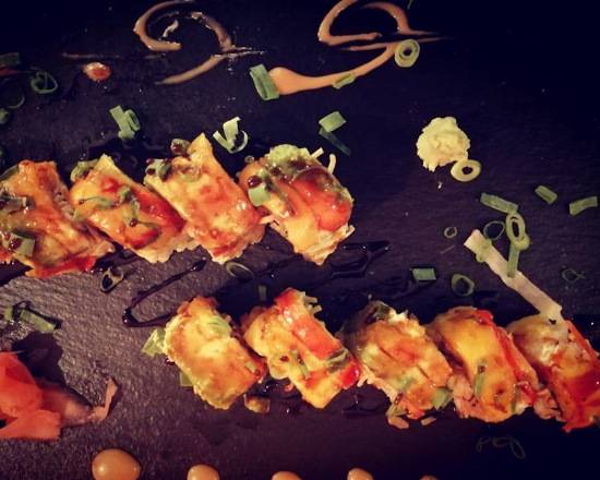 Relleno de surimi empanizado, atún, queso crema, aguacate, cobertura de queso con tanuki, bañado de cebollino, miel de soya, srirasha y salsa wasabi ligera.