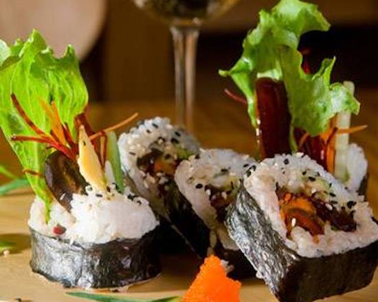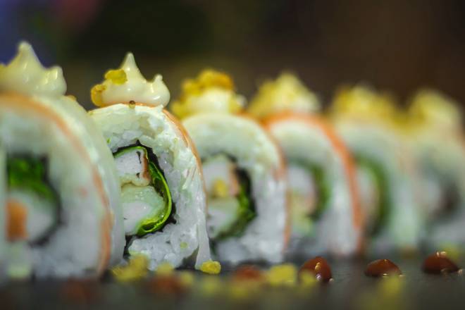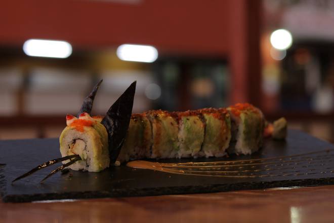 Relleno de kanikama, pepino, agucate. cobertura de anguilla, aguacate, bañado de miel de soya, masago y semillas de ajonjolí. Contenido; 1 miel de soya, 1 gari pink, 1 sobre de palillos. ''Ahumado lo tradicional con la fusión''.