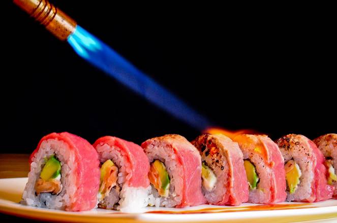 Relleno de Salmón, queso crema, aguacate, cobertura de sabana de lomo de res, perfumado con aceite de ajonjolí, flameado y bañado con salsa balsámica y miel de soya ligeramente picante.