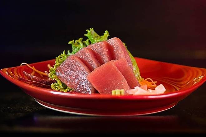 Lonjas de Atún montada sobre Kizami de zanahoria, acompañados de wasabi y gari pink.