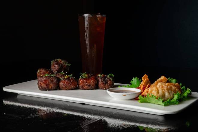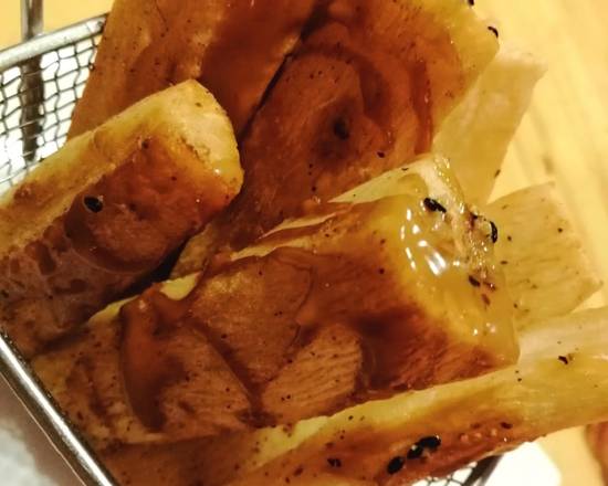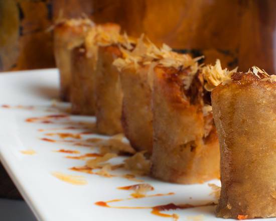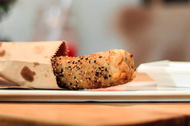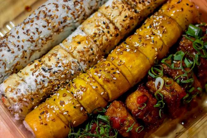 Relleno de plátano maduro, dip de surimi, cobertura de queso crema, semillas de ajonjolí, cebollino, bañado de salsa de miel de soya, salsa golden y cebollino.
