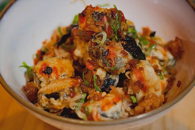 Crujientes bocados de sushi rellenos de tampico en salsa golden picante, cebollino y miel de soya montados sobre arroz sushi meshi.