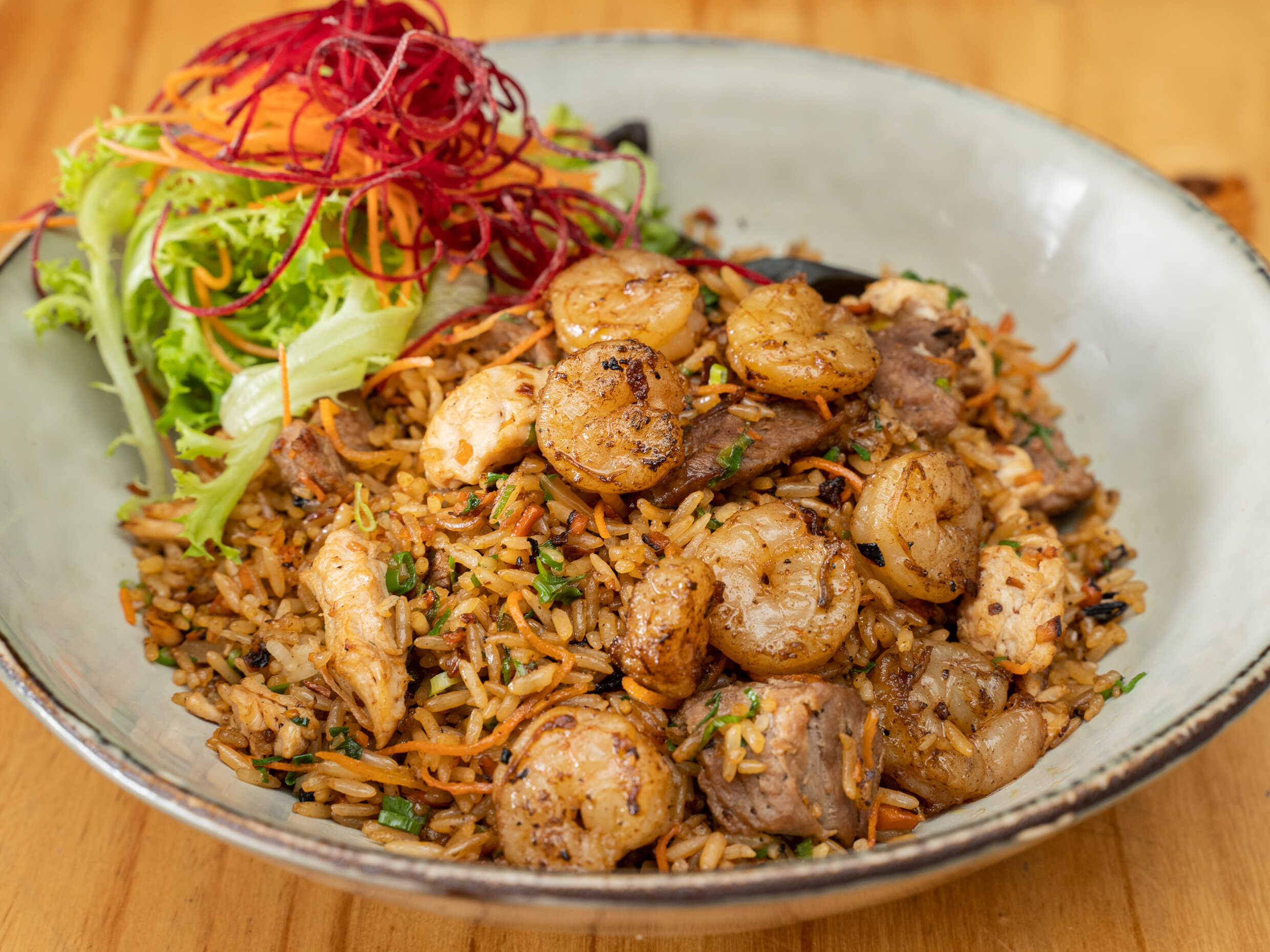 Arroz con vegetales mixtos, huevo, carne, pollo y camarón.