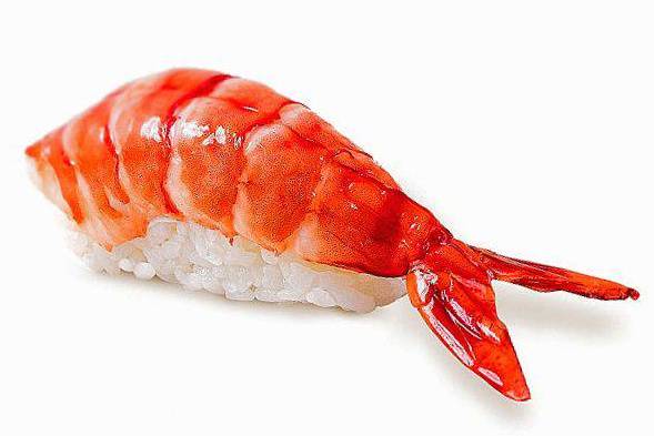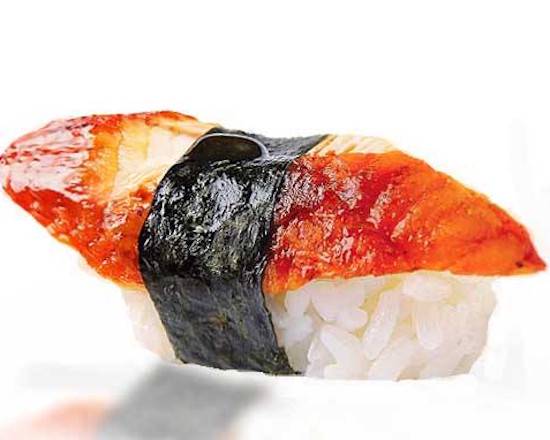 Camarón cocido agridulce montado sobre una cuadrito de arroz de sushi.