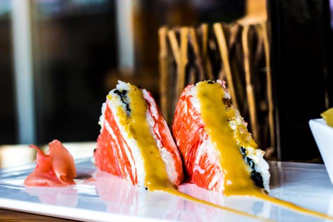Relleno de tampico de mango, pescado empanizado, crocante Novoa y aguacate, cobertura de semillas mixtas y salsa de miel de soya muy levemente spicy.