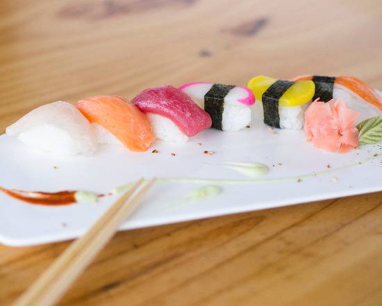 Siete piezas variadas de niguiris : Salmón, Atún. Kanikama, Kamaboko, Izumi day, Takuam y abocado.
