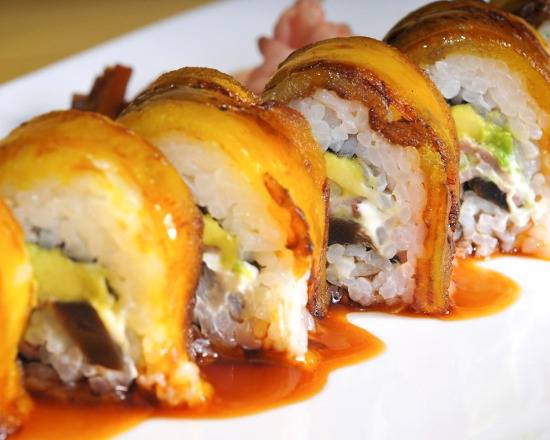 Cobertura de plátano maduro, pepino, ninjin teriyaki, surimi, queso crema, aguacate y miel de soya. Contenido; miel de soya, un Gari Pink, un sobre de palillos. ''Ahumado lo tradicional con la fusión''.