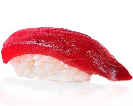 Lonjas de Atún montada sobre un bolita de arroz de sushi, acompañados de wasabi y gari pink.