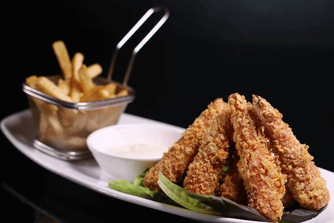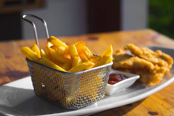 Dedos de pollo empanizados, acompañados de papas fritas en salsa que tú prefieras.