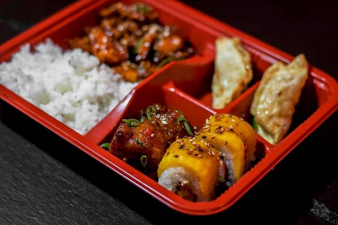 Lomo De Res en salsa teriyaki Arroz al Vapor al estilo japonés, 2 de korokke/ 2 piezas,Tico Roll / 2 piezas. Vietnamita Surimi.